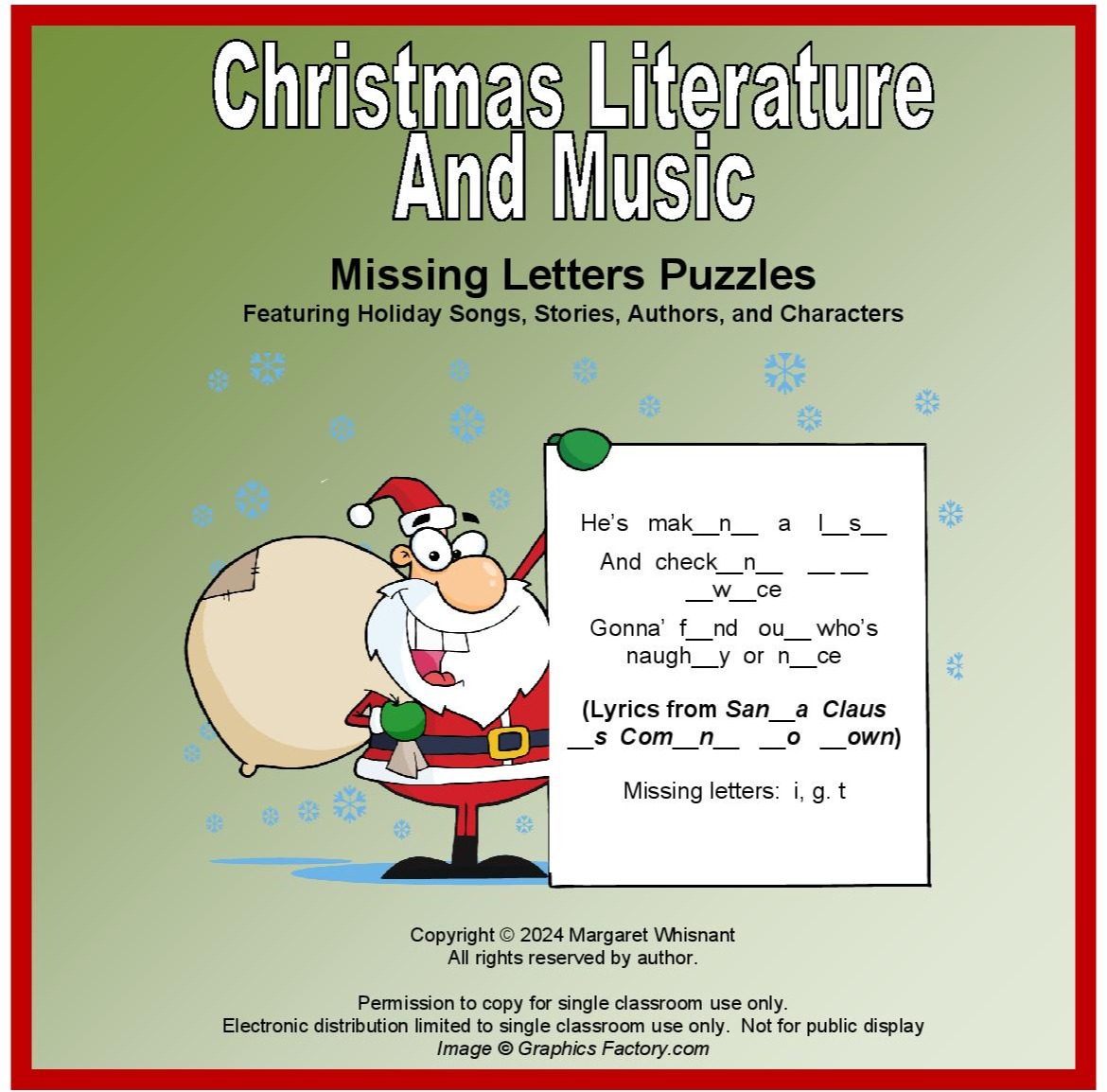 This activity is two sets of printable worksheets with 15 items each. Each one presents a well-known holiday song, story, character, or author, but with missing letters. Students must use the given clues, insert the three missing letters in the correct blanks, and solve the puzzle. Prize delivery delegated to Santa (aka The Teacher).