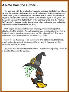Halloween Vocabulary Spelling Writing with Double, Double Letters/Grades 6-8 begins with a two-part worksheet printables, one with 30 items and the second with 25. The activity focuses on words whose spellings include two sets, or even three sets, of double letters