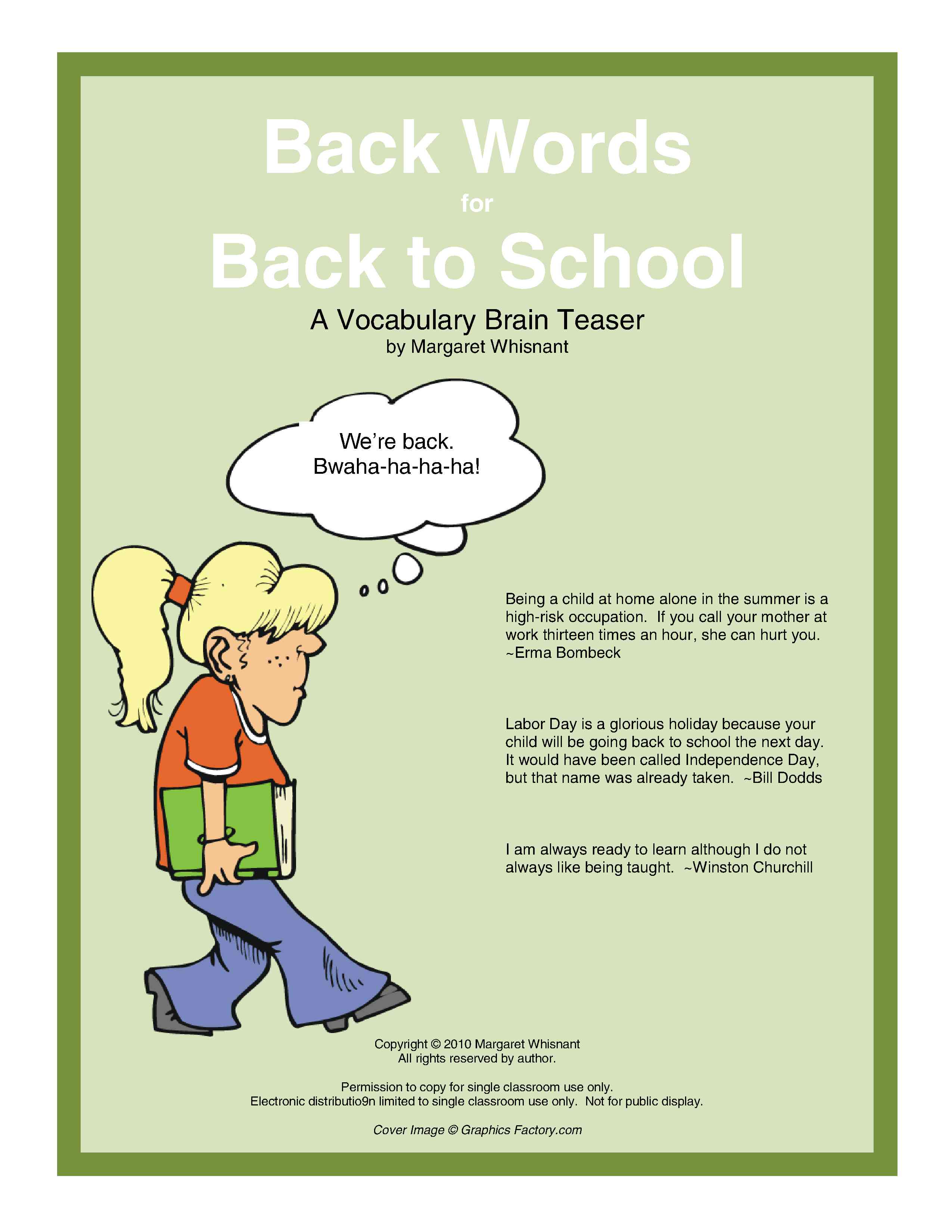 Finally, a list of back words and phrases not used in the two activities and a separate list of school words and phrases are included as a teacher’s resource for assigning student-created puzzles, poems, posters, etc. Everything is free.